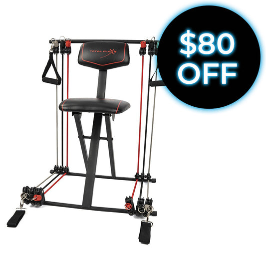 Total Flex M is a compact home gym exercise equipment that comes with a padded seat, back rest and 3 bands for 7 levels of resistance to help you perform 40 different exercises.
